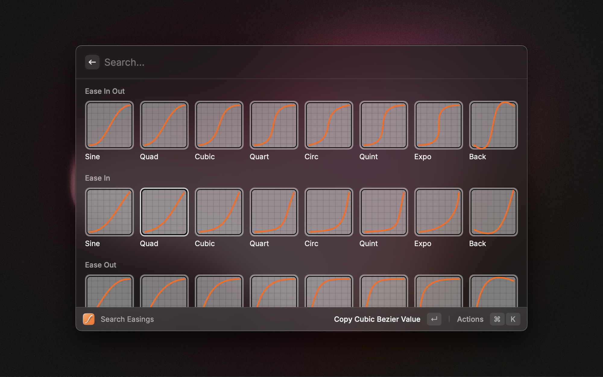 Easings are used in animations to describe how a movement starts and how it stops. But there are many ways to describe such a thing. At that point, you know the drill: there’s an extension for it. The Easings extension made by Ankur Chauhan gives you access to lots of Bezier values so that you can quickly copy them to your clipboard. It also allows you to preview the animation directly from Raycast.