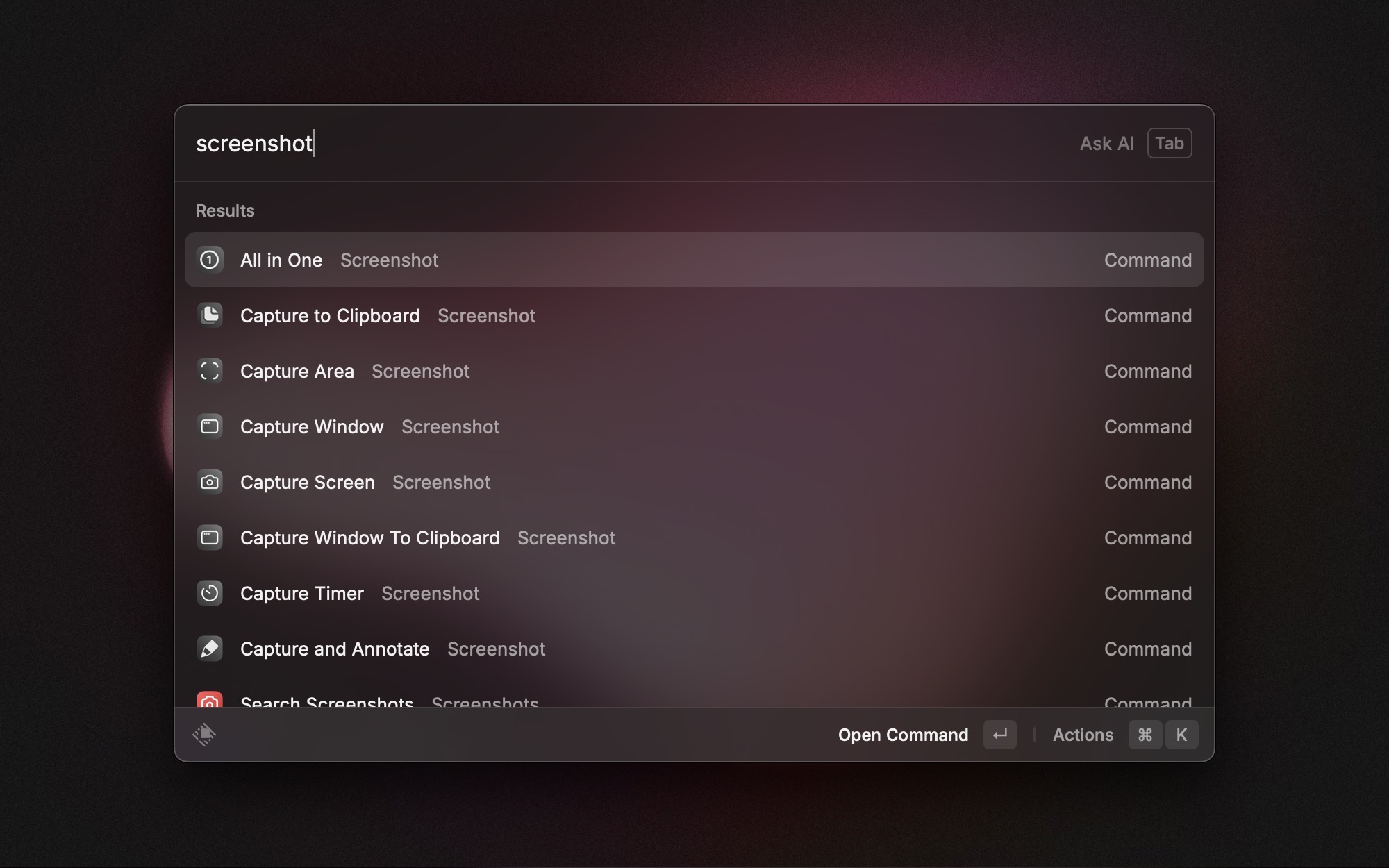 If you prefer to go the fully-native way and use the built-in Mac tools, there’s also a Raycast extension made by Aayush: Screenshot. Like with the CleanShot X extension, there’s a bunch of commands for every screenshot you can take.