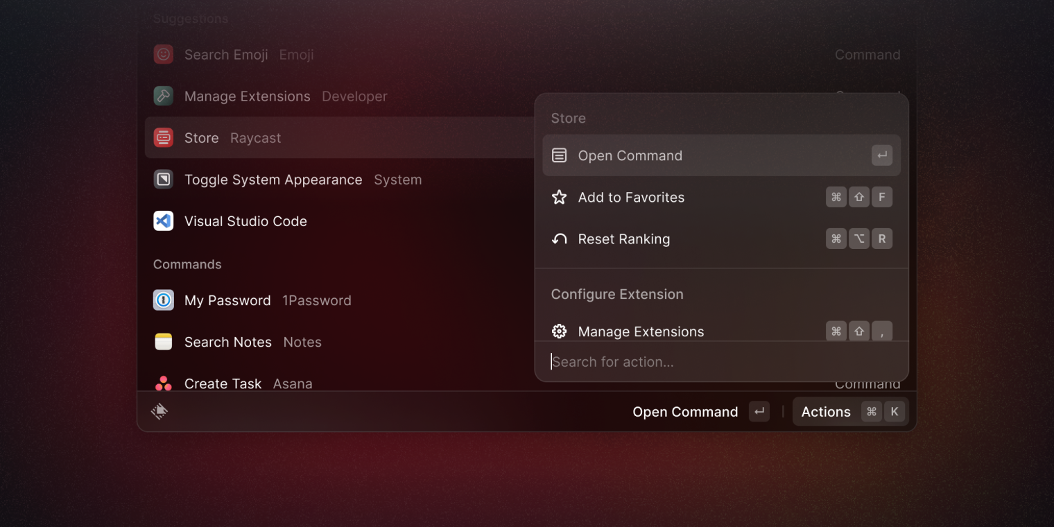 In our progress to move our native Extensions over to the Store and open source them, we began migrating Linear, re-writing the entire Extension in TypeScript. We're proud that the API can power such complex extensions, and the Linear extension is now available for your contribution. We've also open sourced the Google Workspace, Zoom and Asana extensions after Launch Week.