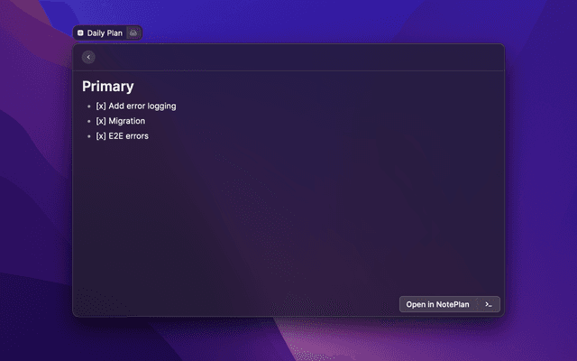 Allows you to see your daily plan, complete tasks, search notes and launch straight into NotePlan.
